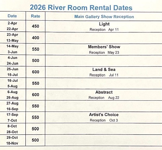 - River Room rental is available to River Arts’ members. Because of the overwhelming interest in reserving River Room space, River Arts will conduct a members’ lottery in the fall of 2025 for the 2026 season. Solo, duo or small group shows are permitted. All showing artists must be members of River Arts. The rental price ranges from $400 to $600.